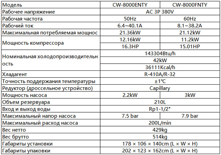 Охладитель воды CW-8000 прост в использовании и эксплуатации и поставляется с 2-летней гарантией. Рым-болты, установленные в верхней части чиллера, позволяют поднимать агрегат с помощью ремней с крюками. Установка должна производиться на ровной твердой поверхности в помещении, чтобы избежать наклона. Благодаря удобному сливному отверстию, установленному на задней панели чиллера, пользователи могут легко сливать воду. Доступны 50 Гц/60 Гц и 380 В/415 В/460 В.