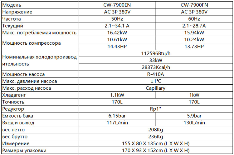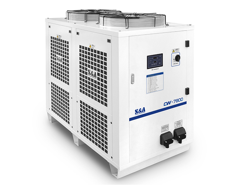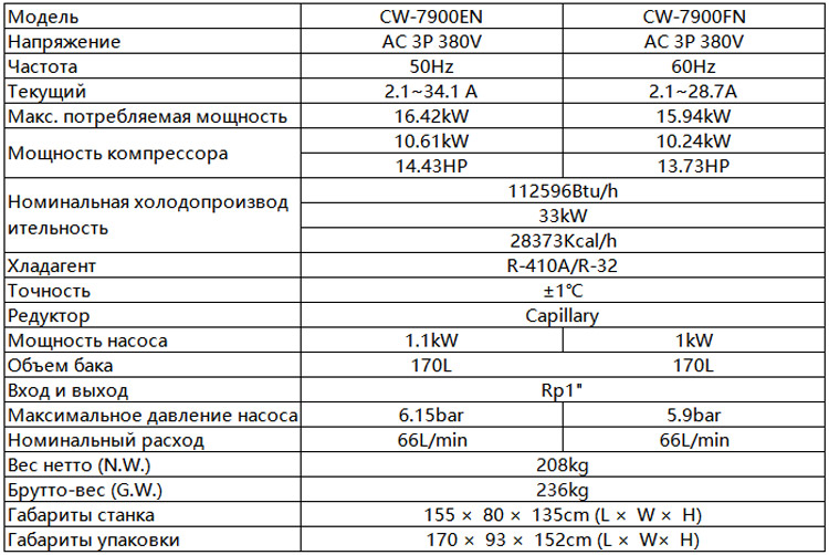 СЧиллер шпинделя с ЧПУ CW-7900 позволяет поддерживать производительность шпинделя станка с ЧПУ до 170 кВт. Этот технологический охладитель отличается большой холодопроизводительностью (33 кВт) и интеллектуальной панелью управления температурой. Под интеллектуальным мы подразумеваем, что температура воды может регулироваться автоматически, а встроенные сигналы тревоги являются как визуальными, так и звуковыми. Чиллер замкнутого цикла CW-7900 прост в использовании и эксплуатации, на него предоставляется 2-летняя гарантия. Рым-болты, установленные сверху водоохладителя, позволяют поднимать агрегат с помощью ремней с крюками. Установку следует производить на ровной твердой поверхности внутри помещения во избежание наклона. Благодаря удобному сливному отверстию, установленному на задней части чиллера, пользователи могут легко сливать воду. Рекомендуемая периодичность замены воды составляет 3 месяца или зависит от фактических условий использования, включая фактическую рабочую среду и фактическое качество воды.