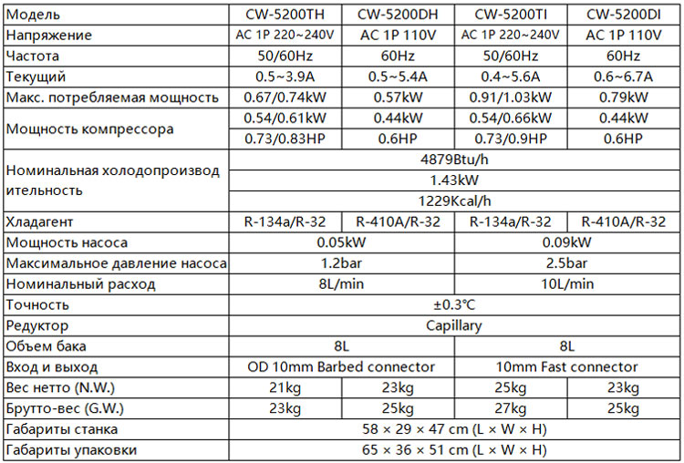 С помощью водяного охладителя CW 5200 ваш CO2-лазер может быть должным образом охлажден. Этот мини-охладитель воды мощностью до 130 Вт CO2-лазера постоянного тока или 60 Вт RF CO2-лазера может обеспечить высоконадежное охлаждение. Он обладает температурной стабильностью ± 0,3 ° C, а также холодопроизводительностью до 1430 Вт.